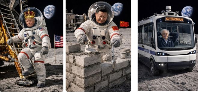E in un certo senso è vero: guardate come in pochi istanti ho ottenuto le immagini di King Trump che sta sbarcando da Artemis II nel 2027 pronto a intestarsi una decina di crateri e almeno un “mare” della luna. Certo non quello della Serenità, però. Ed anche di XiJinping in veste di palazzinaro che costruisce una base lunare permanente e di un autobus a guida autonoma utile per assicurare la mobilità lunare.
